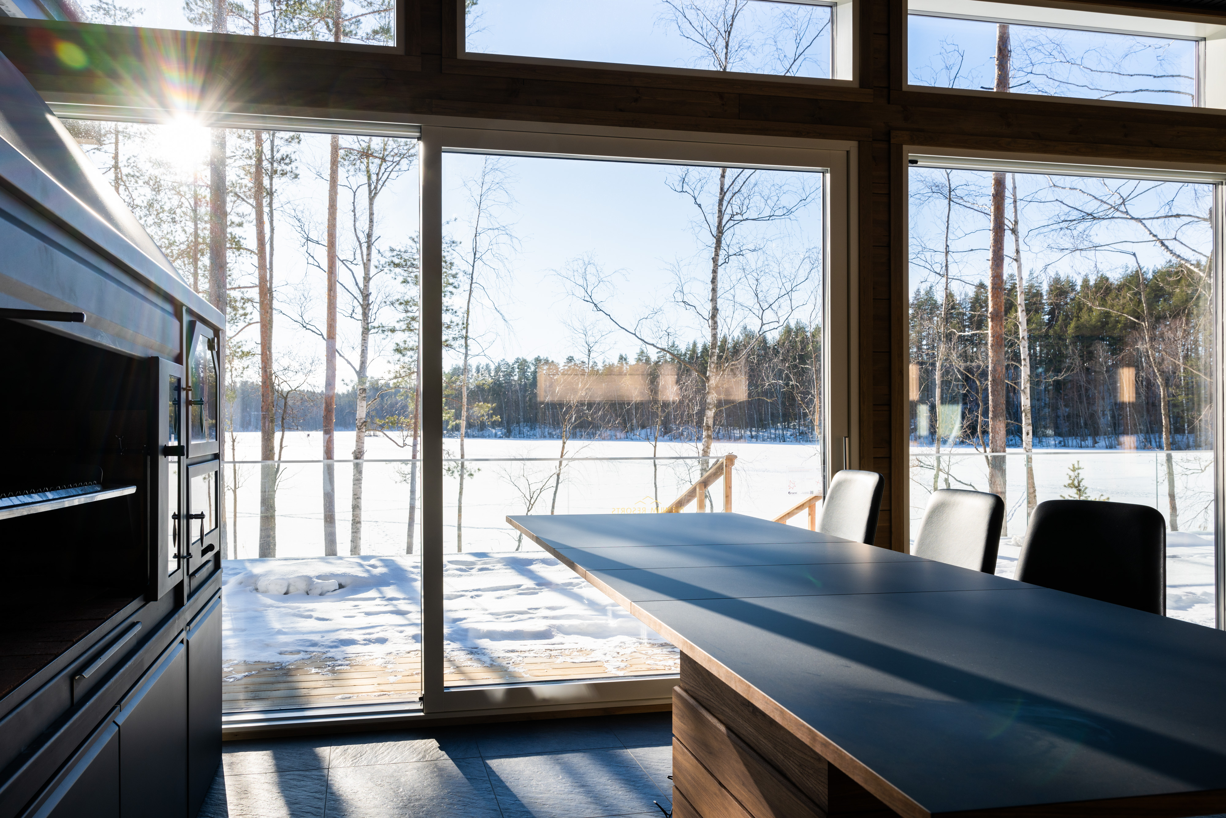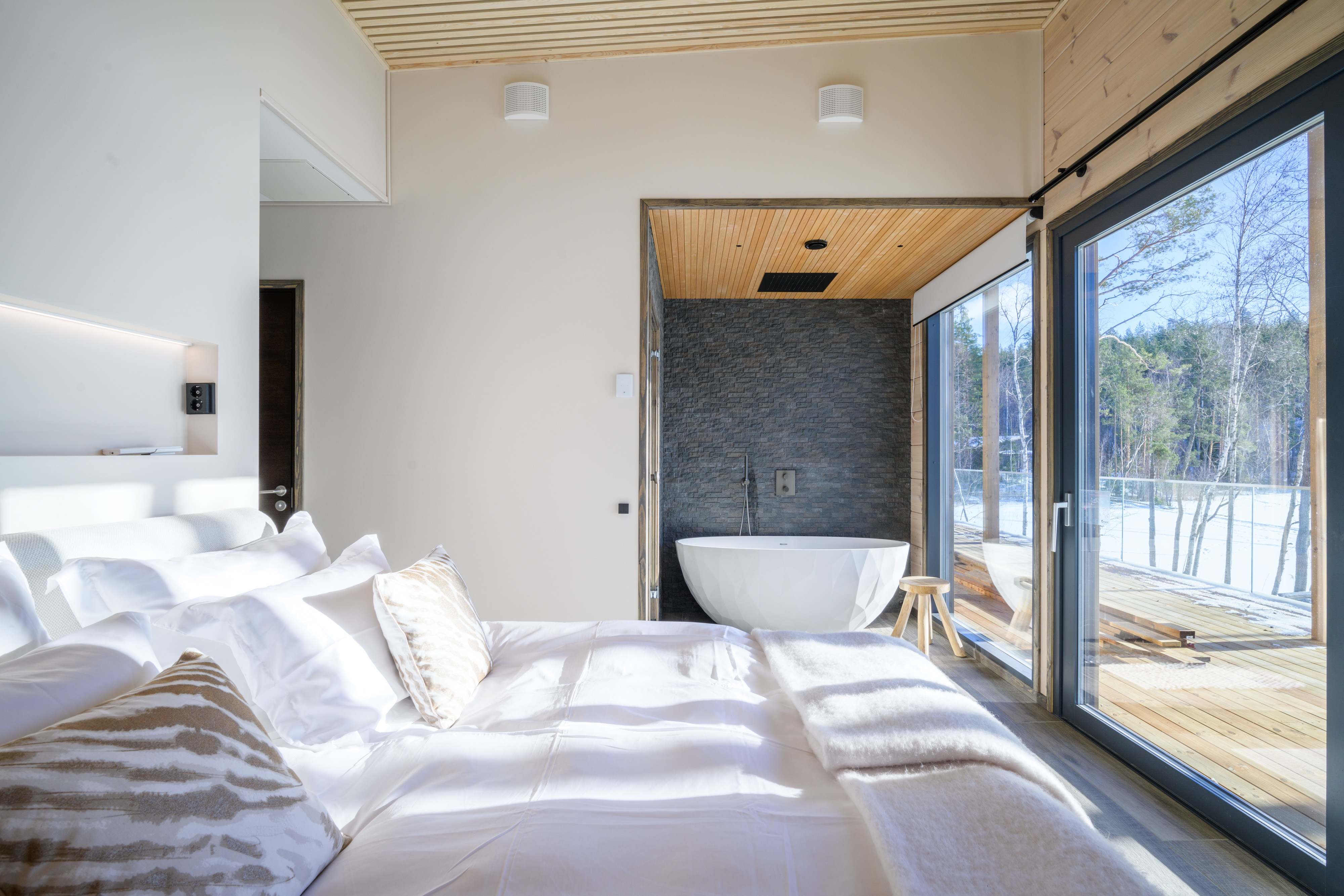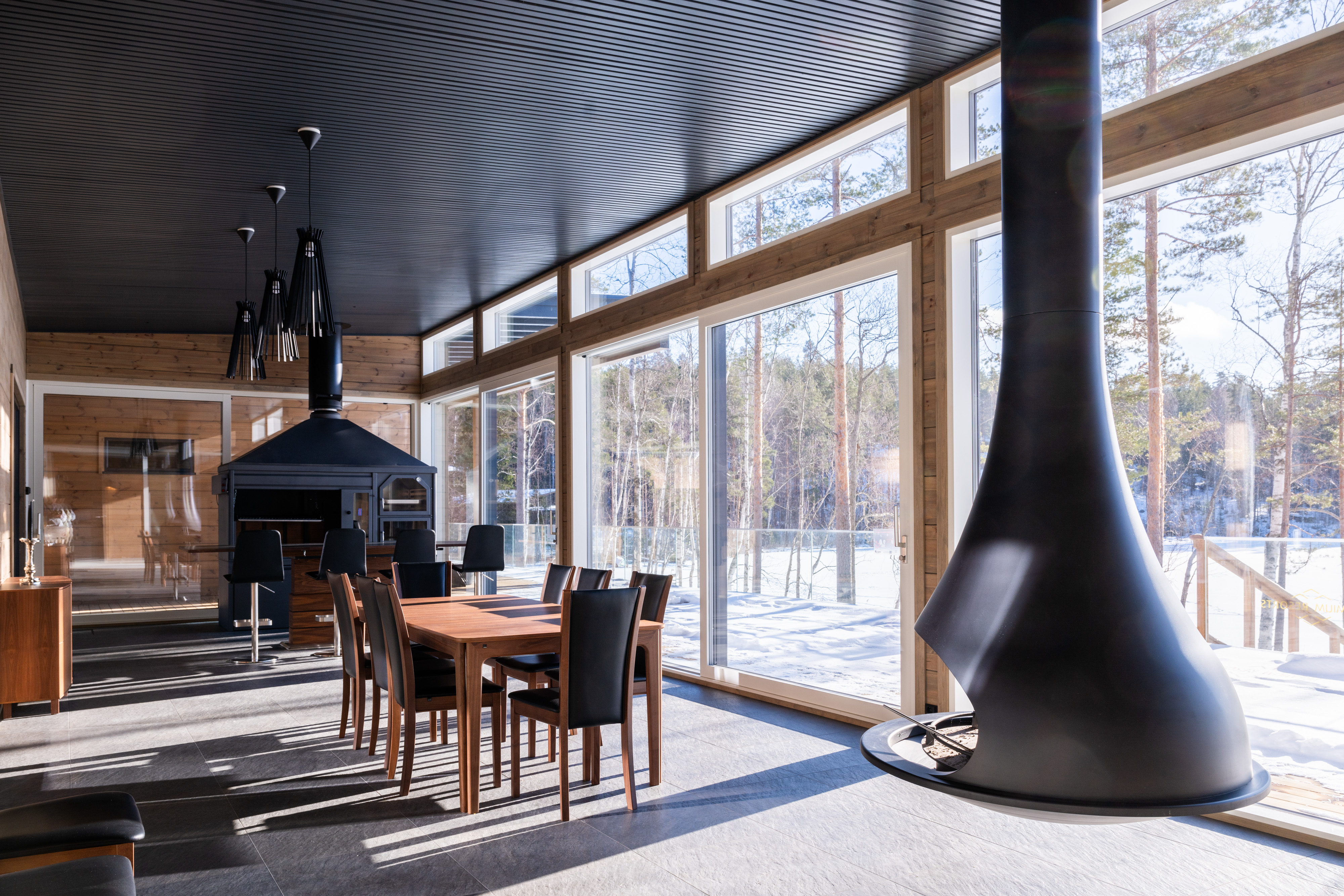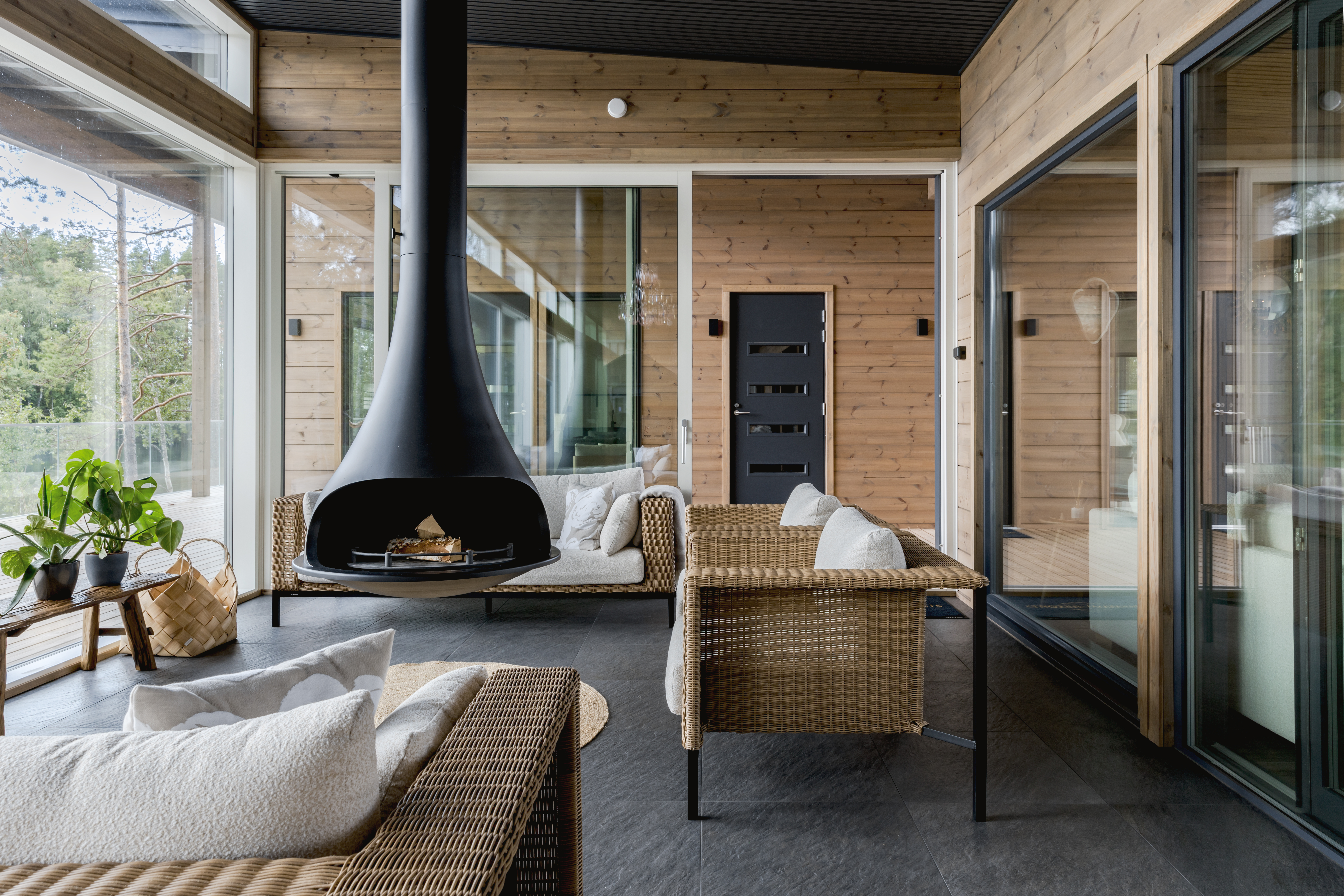 - Ulkotilat: Suuri terassi, poreamme, järvenrantayhteys, argentiinalainen grilli